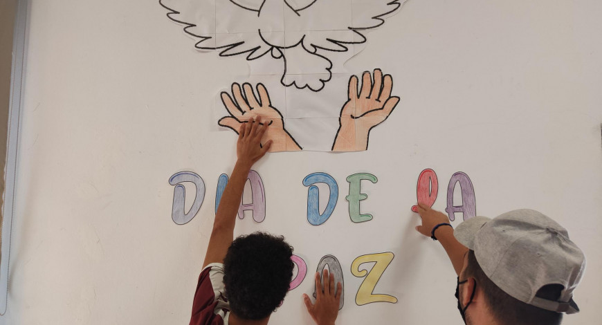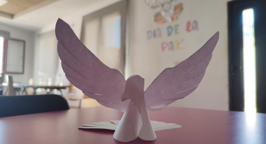 Posteriormente se ha realizado un pequeño mural memorativo, donde los menores del centro han ordenado, coloreado, recortado y pegado una paloma blanca que alza el vuelo al cielo tras ser soltada por unas manos y las letras donde se puede leer "Día de la paz".